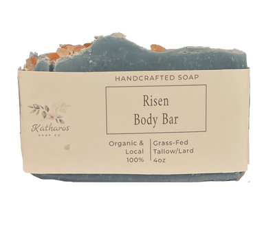 Organic and made with 100% local ingredients! Ingredients: grass-fed lard/tallow, sodium hydroxide, filtered water, essential oil blend, blue mica...