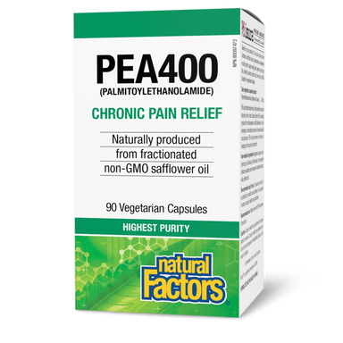 Natural Factors PEA400 is a chronic pain relief formula made from fractionated non-GMO safflower seed oil. Palmitoylethanolamide (PEA) is a fatty-a...