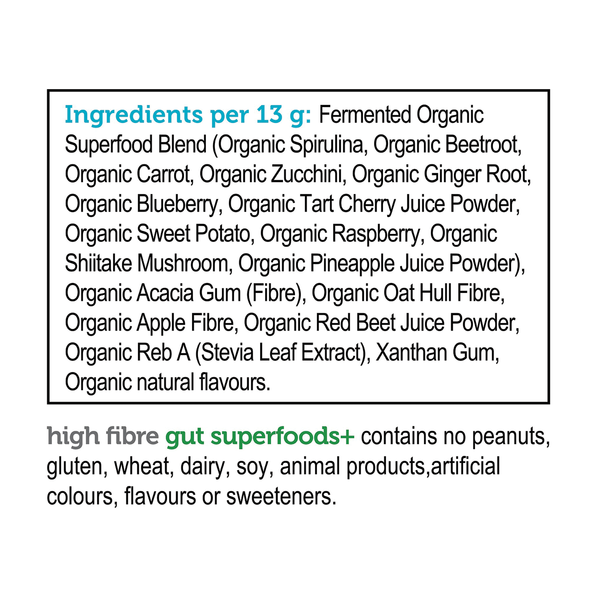 high fibre gut superfoods+ is packed with nutrient-dense whole foods. This vibrant, rainbow-inspired blend brings together the best nature has to offer, providing a boost with fresh, high-quality fruits and a variety of land and sea vegetables.