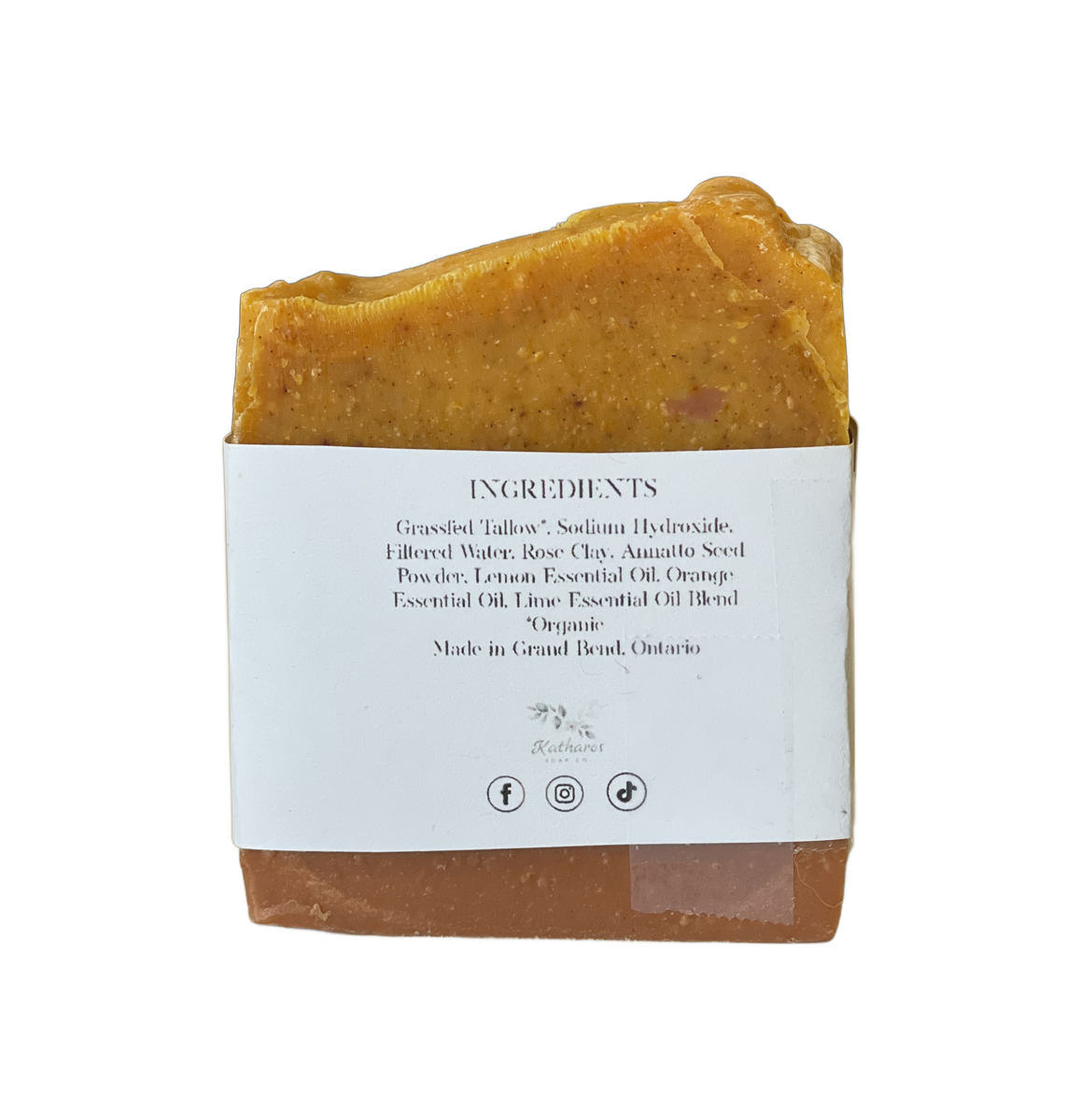 Ingredients: Grassfed tallow, sodium hydroxide, filtered water, rose clay, annatto seed powder, lemon, orange, & lime essential oils.
