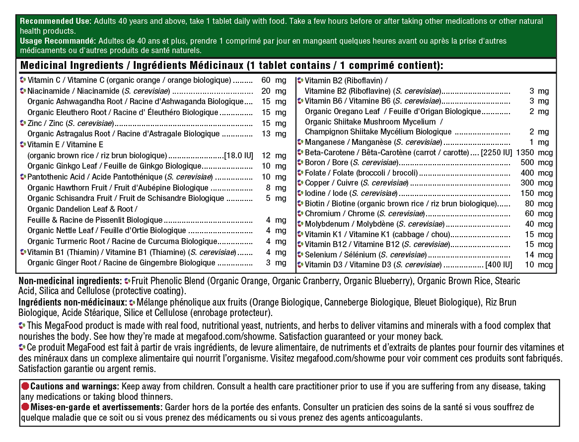 MegaFood® Men Over 40™ One Daily is specifically formulated without iron to support the health and wellbeing of men over the age of 40. (Iron is not recommended for men unless specifically directed by their healthcare practitioner.) Our multi nourishes the body in a convenient, once-daily tablet and includes important micronutrients as well as whole foods and herbs providing phytonutrients for optimal well-being.