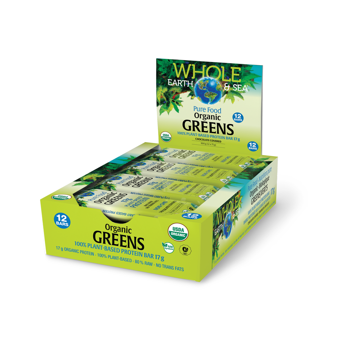 The Whole Earth & Sea Pure Food Vegan Greens Protein Bar is the next generation of on-the-go whole-food nutrition. The ingredients are 80% raw and 100% gluten free, organic, non-GMO, and kosher. Based on science, it is one of the most nutritionally robust and alkaline-forming bars on the market – and it doesn’t sacrifice one bit on flavour. This convenient, deliciously satisfying bar is covered in antioxidant-rich dark chocolate. Each bar has 15 g of high-quality vegan protein, making it the perfect choice for between-meal snacking or post-workout recovery.